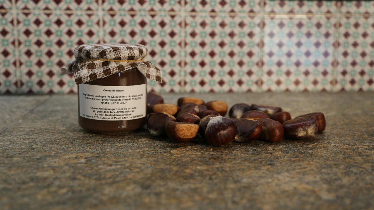 Crema artigianale realizzata da Massimiliano Gastaldi con castagne raccolte in Valle Pesio, in boschi aziendali ben curati in cui crescono piante di castagno da frutto di diverse varietà.